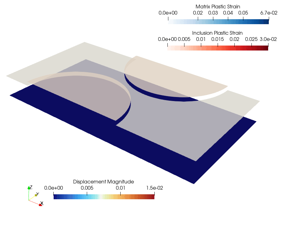 This demo builds upon the COMET cohesive zone models tutorials. While the latter focus on a damageable interface behavior and elastic behavior inside the phases, the present demo assumes an elastic behavior of the interface and different nonlinear plastic behaviors inside both phases. Both approaches can obviously be combined together.