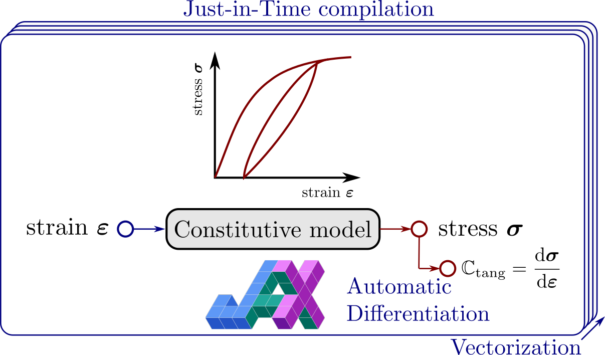 jaxmatprovides domain-specific abstractions that simplify the definition of complex material models. It is not a database of hard-coded material behaviors with fixed parameters. Instead, it offers a generic and extensible framework for users to define, compose, and calibrate their own constitutive models with minimal boilerplate.Differentiability: We fully exploit JAX’s Automatic Differentiation (AD) capabilities to eliminate the need for manually deriving consistent tangent operators, Jacobians of implicit systems, normal vectors to plastic surfaces, hyperelastic stress expressions, and more. In